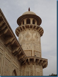 … to rejoin the ship. Our long day, which began at 4 am, continued with a trip to the “Baby Taj Mahal” – officially called Itmad-ud-Daulah. Built in 1622 by Empress Noor Jahan, it may be the only memorial tomb built by a daughter for her father, the Prime Minister of the Mughal court. It was the first building made of white marble, and has many similarities to the Taj Mahal, including four red sandstone entrance gates; however, unlike the Taj, only one is functional, the other three added only for symmetry. It also has four minarets, inlaid inscriptions from the Quran, and beautiful gardens. The building holds coffins of many family members, housed in separate chambers.